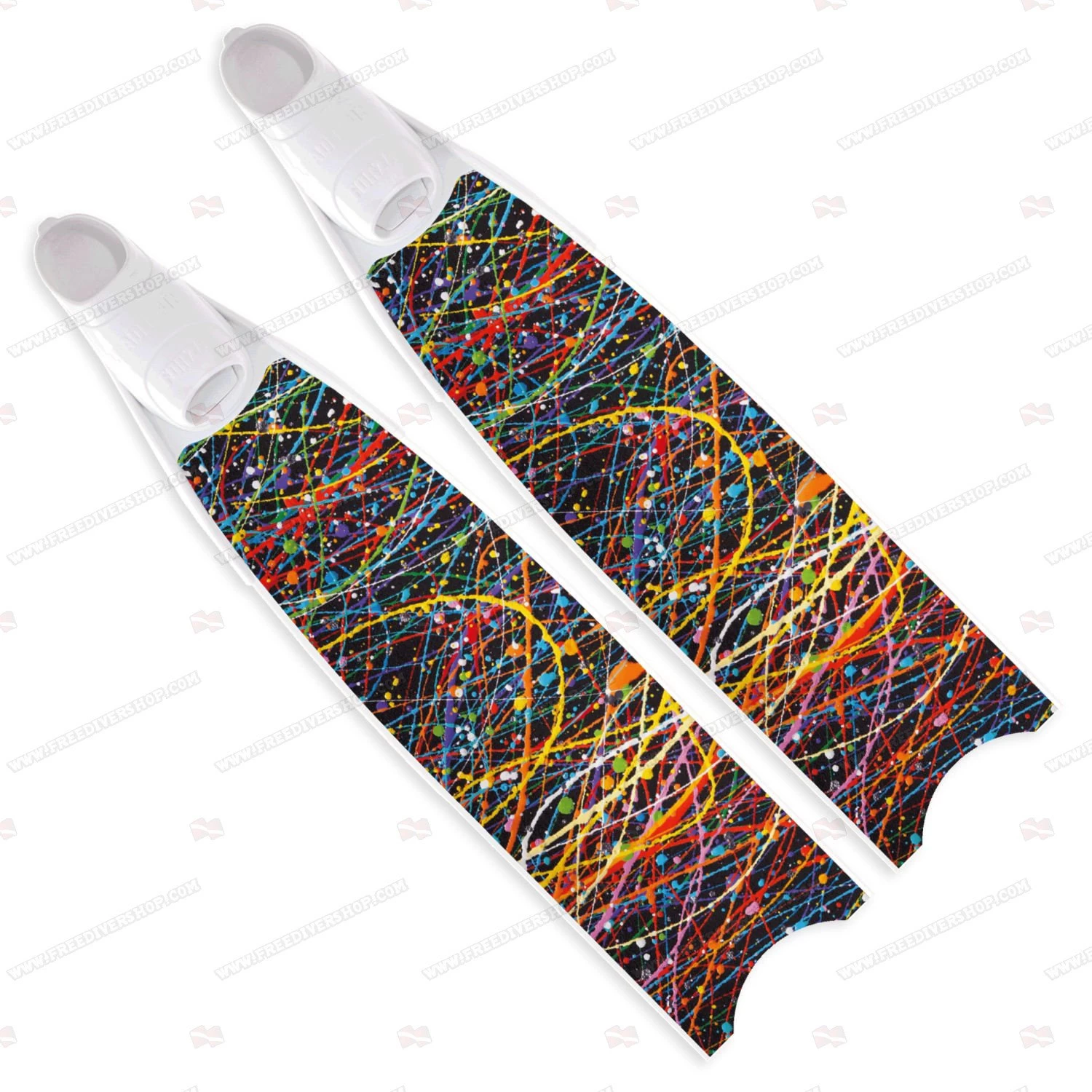 High quality limited edition freediving and spearfishing fins with Paint Drop design, hand made blades from 100% carbon / fiberglass, processed under vacuum in molds.